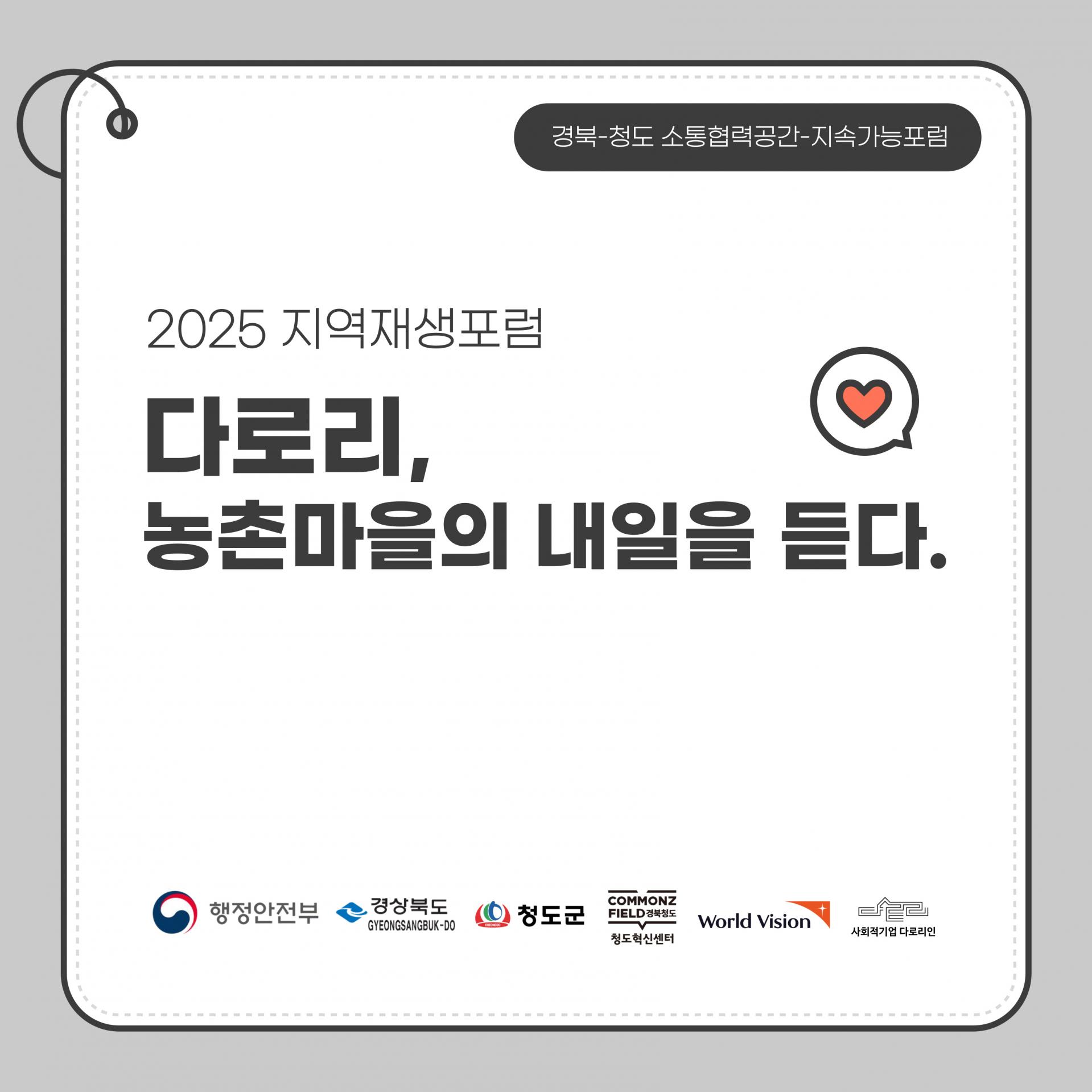 이번 주 금요일에 진행되는 <2025 경북-청도 지역재생포럼 : 다로리, 농촌마을의 내일을 듣다> 많은 관심 부탁드려요! 😊