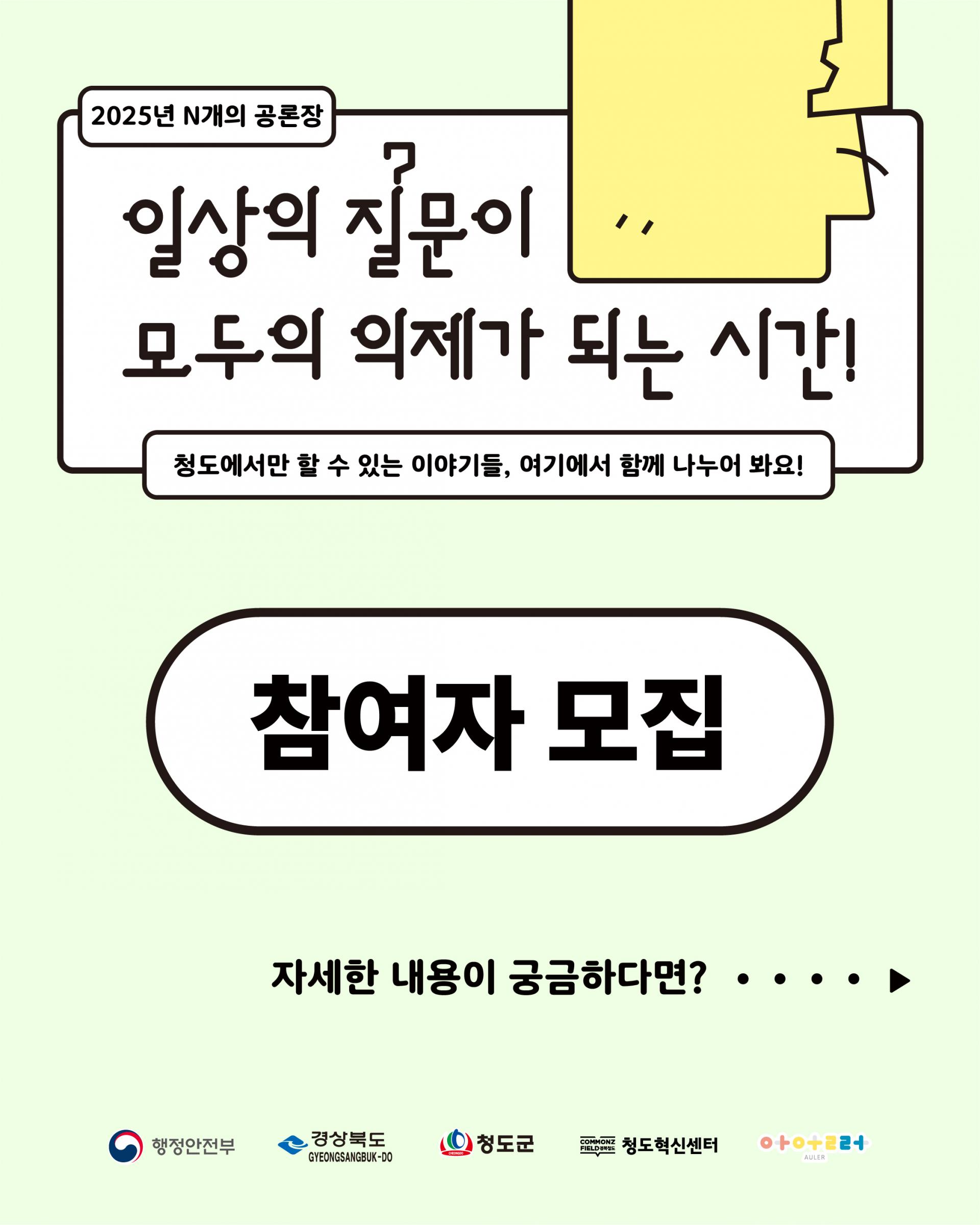 2025년 청도 N개의 공론장 참여자를 모집합니다!더 많은 분들이 함께할 수 있도록 일정을 조정하였으니 이번 기회에 꼭 함께해 주세요🙌