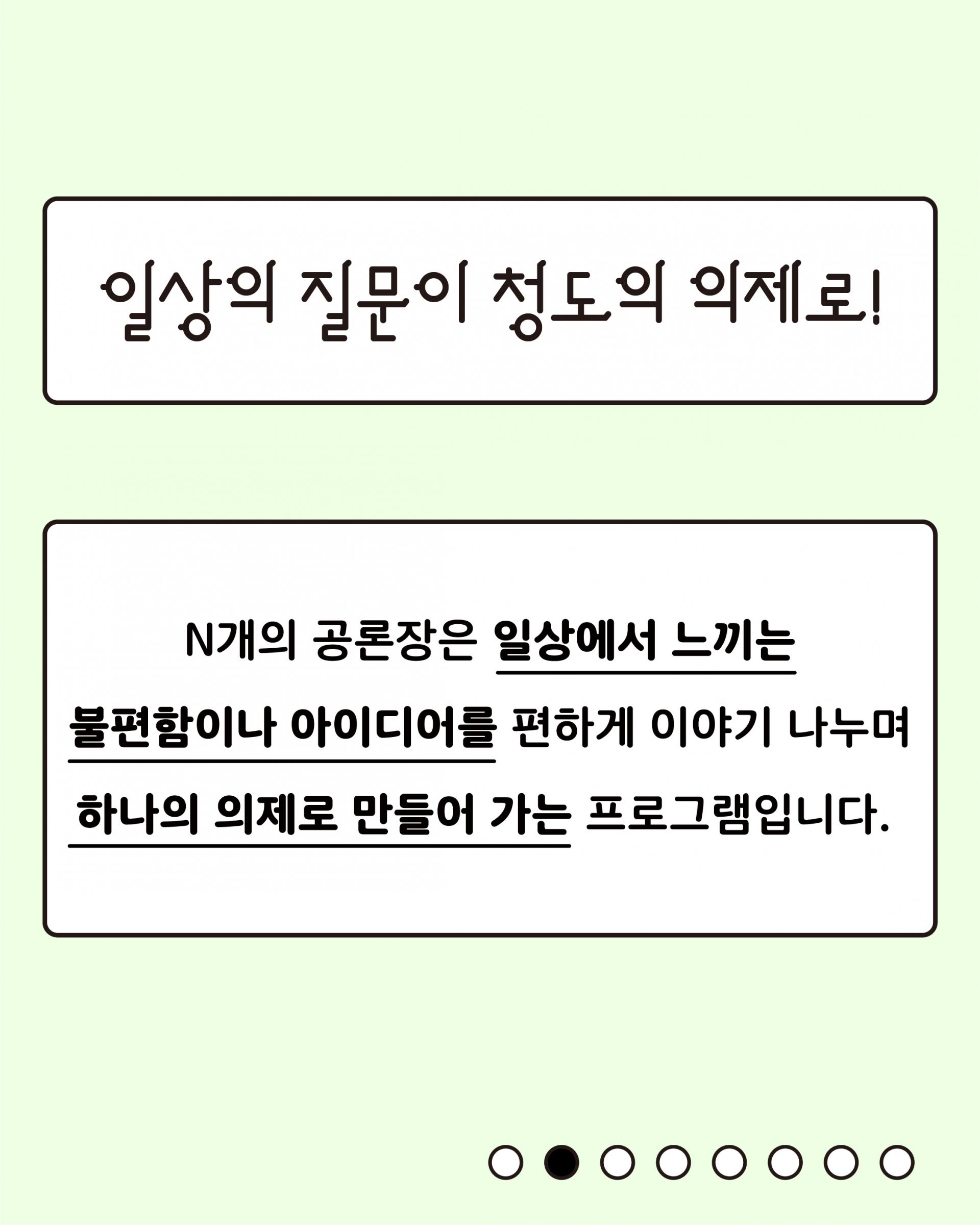 N개의 공론장은 일상에서 느끼는 불편함이나 아이디어를 편하게 이야기 나누며,💬하나의 의제로 만들어 가는 프로그램입니다😁