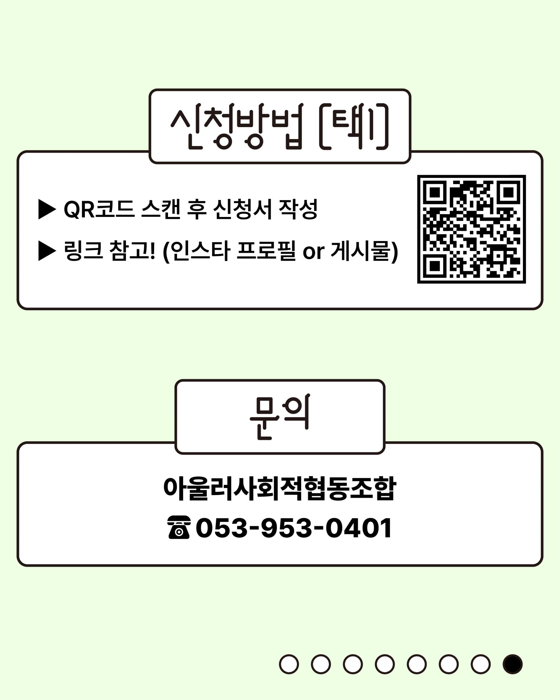 📌신청 방법 : 카드뉴스 내 모집 QR / https://forms.gle/GgM7PFemv8XkXqe26📌문의 : 아울러사회적협동조합(053-953-0401)